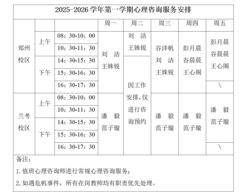 2. 如遇紧急情况,请直接拨打心理健康教育中心电话,联系中心教师(郑州校区:0371-85303525;兰考校区:0371-22775525)。
